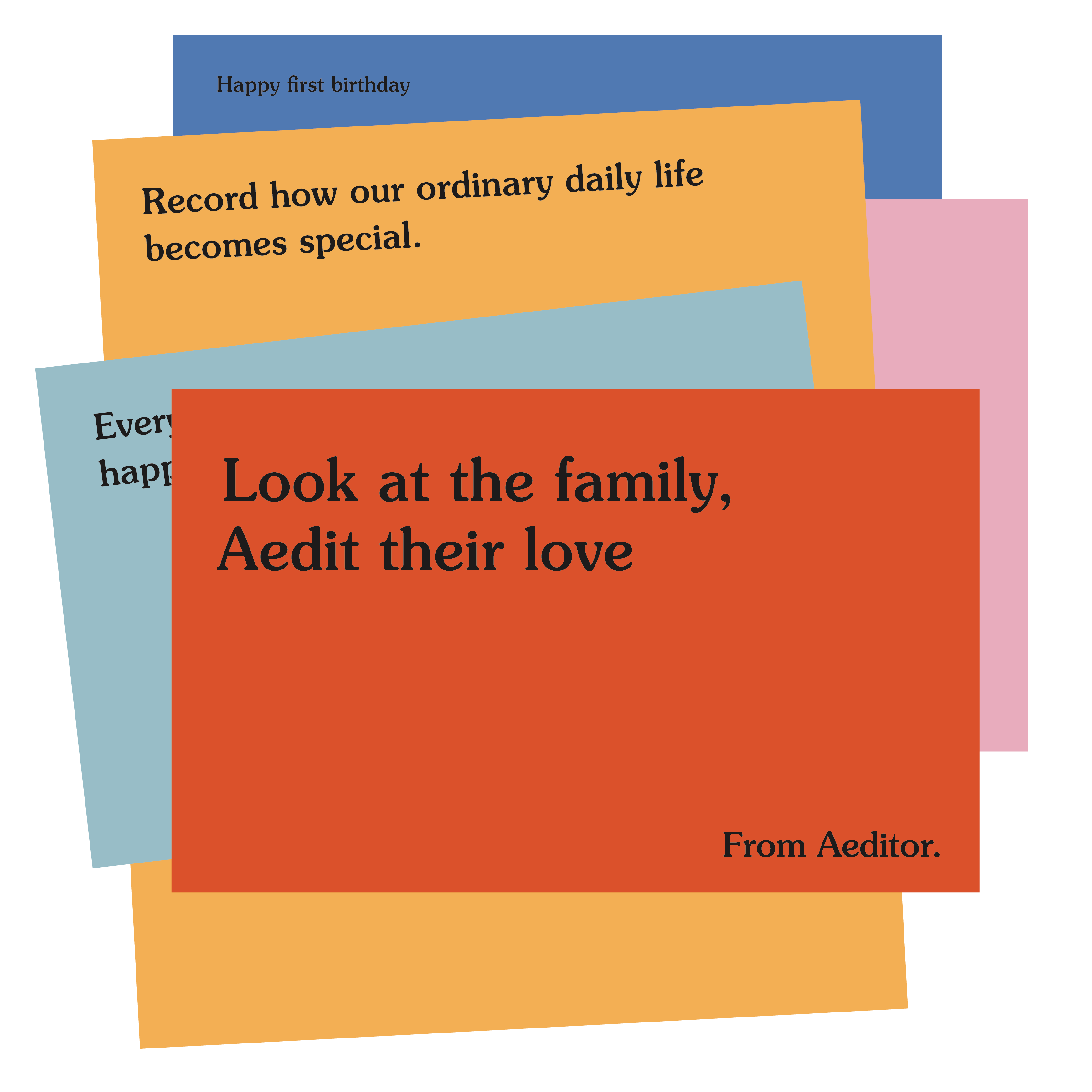 Aeditor Aeditor는 가족의 특별한 하루가 행복한 기억으로 남을 수 있도록 디렉팅하는 브랜드입니다. 아이의 웃음과 가족이 함께하는 순간을 소중히 여겨, 단순한 이벤트가 아닌 따뜻한 인연과 기억으로 이어지도록 기획합니다. 브랜딩은 가족의 일상과 기념일을 연결하는 따뜻한 감성을 시각적으로 표현하는 데 초점을 두었습니다. 세심한 컬러 팔레트와 부드러운 타이포그래피, 간결한 그래픽을 활용하여 브랜드가 가진 안정감과 정성을 담아냈습니다. 이러한 시각 요소들은 홈페이지, 행사물, 굿즈 등 다양한 매체에 일관되게 적용되어 Aeditor가 추구하는 메시지를 명확히 전달할 수 있도록 디자인되었습니다.