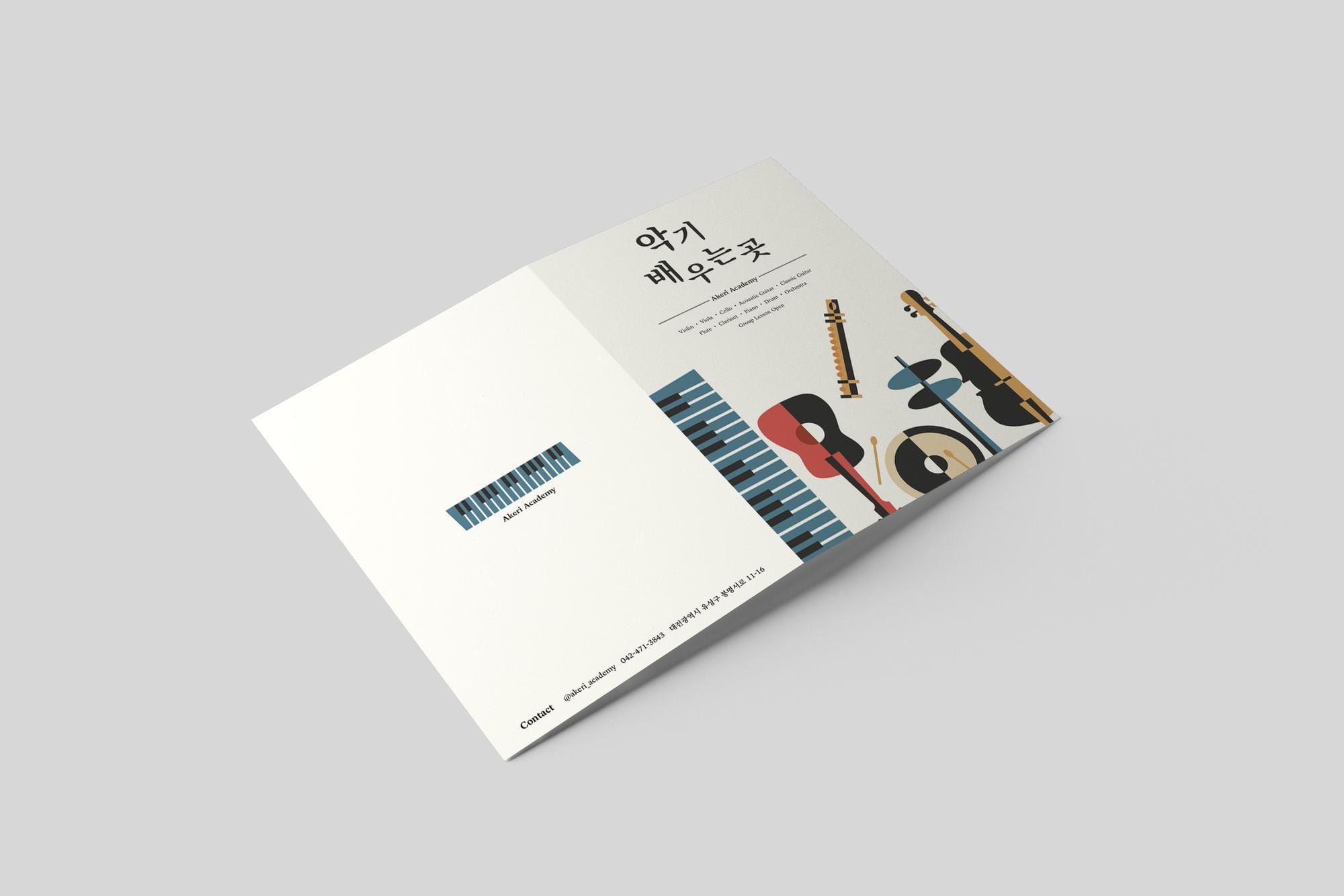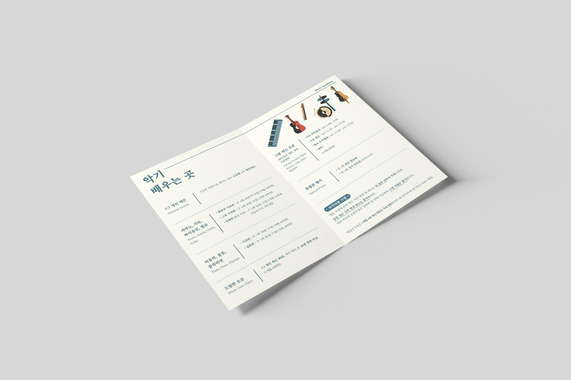 악기 배우는 곳 음악 아카데미 현악기와 타악기 등 다양한 악기를 배울 수 있는 아카데미입니다. 아카데미 내에서 수업코스를 안내하는 목적의 홍보물입니다. 내부는 정보전달을 목적으로 가독성이 높도록 심플하게 디자인하였고, 외부의 메인 그래픽은 다양한 컬러를 사용하여 악기를 다채롭게 표현하고 자칫 복잡해보일 수 있는 악기 형태의 디테일을 단순화하여 심플하게 표현하였습니다.