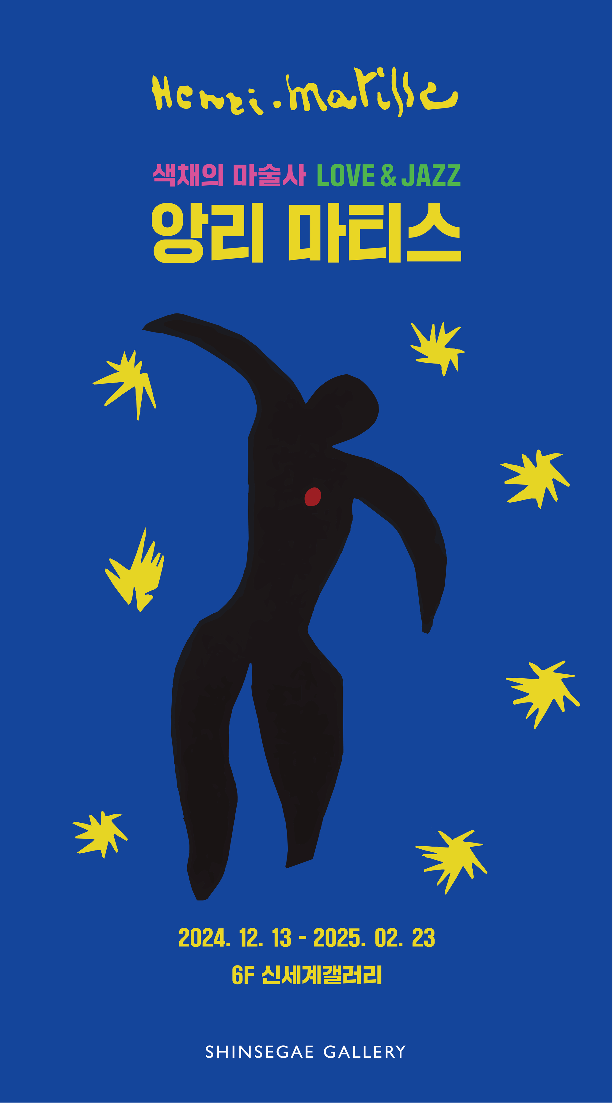 신세계아트앤사이언스 신세계갤러리 LOVE & JAZZ – 앙리 마티스전 앙리 마티스의 컷 아웃과 드로잉, 아티스트북 등 다양한 작품을 선보이며, 강렬한 색채와 자유로운 감각을 전시 전반에 담아낸 기획전입니다. 전시 브랜딩은 마티스 작품의 원색적 에너지와 재즈적 리듬을 시각화하는 데 초점을 두었습니다. 대표적인 색채와 컷 아웃 모티프를 단순화해 그래픽화했으며, 전시장 안내, 인쇄물, 굿즈 등에 일관되게 적용했습니다. 신세계갤러리의 세련된 공간 분위기에 어울리도록 현대적으로 재해석된 컬러와 타이포그래피로 디자인되었습니다.