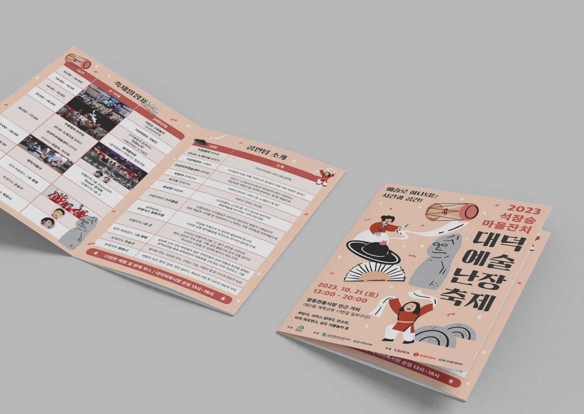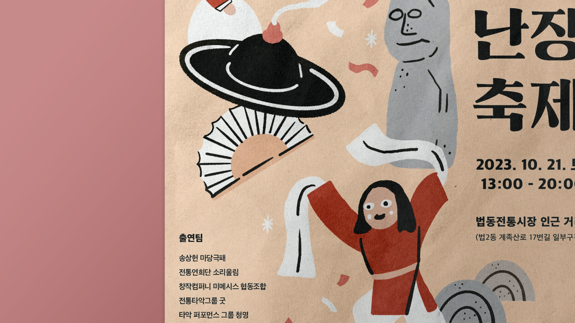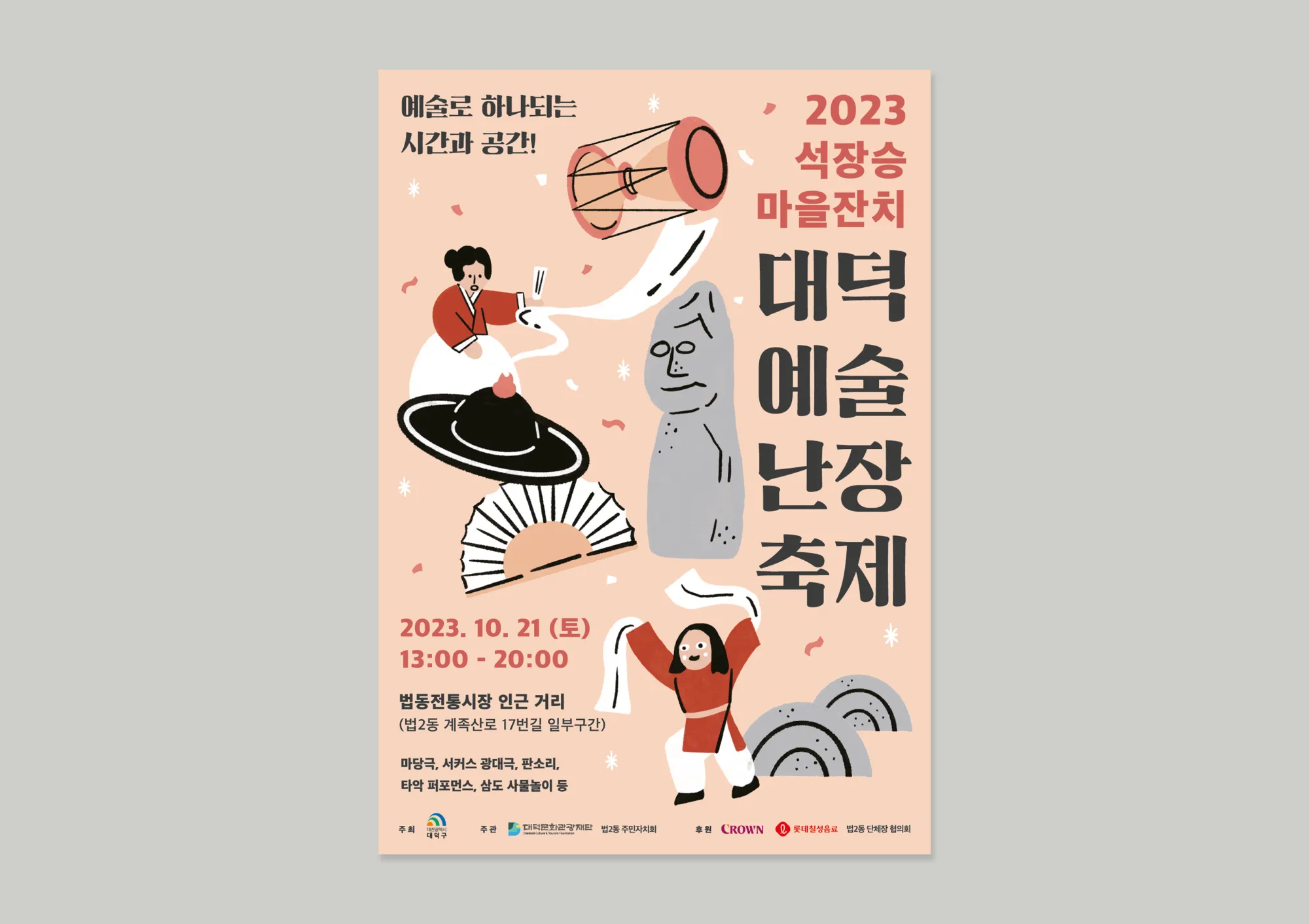 Client : 대덕문화관광재단 마을의 액운을 막고 건강을 기원하는 석장승의 기운을 받아 대덕문화관공재단과 대전 법2동 주민자치회에서 공동주관한 주민화합 마을축제입니다. 대전광역시 민속문화재 제1호 법동 석장승은 수백년전부터 재앙과 질병으로부터 마을 사람들을 보호하기 위해 세워진 장승입니다. 마을을 지키는 듬직한 석장승의 딱딱하고 오래된 느낌을 밝은 컬러와 핸드드로잉 일러스트로 부드럽게 표현하였습니다. 마을 축제에서 즐길 수 있는 요소들로 일러스트를 구성하여 포스터를 통해 쉽게 축제의 성격도 파악할 수 있도록 표현하였습니다.