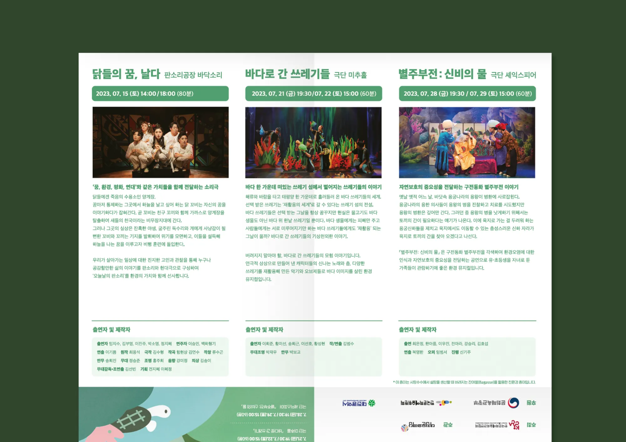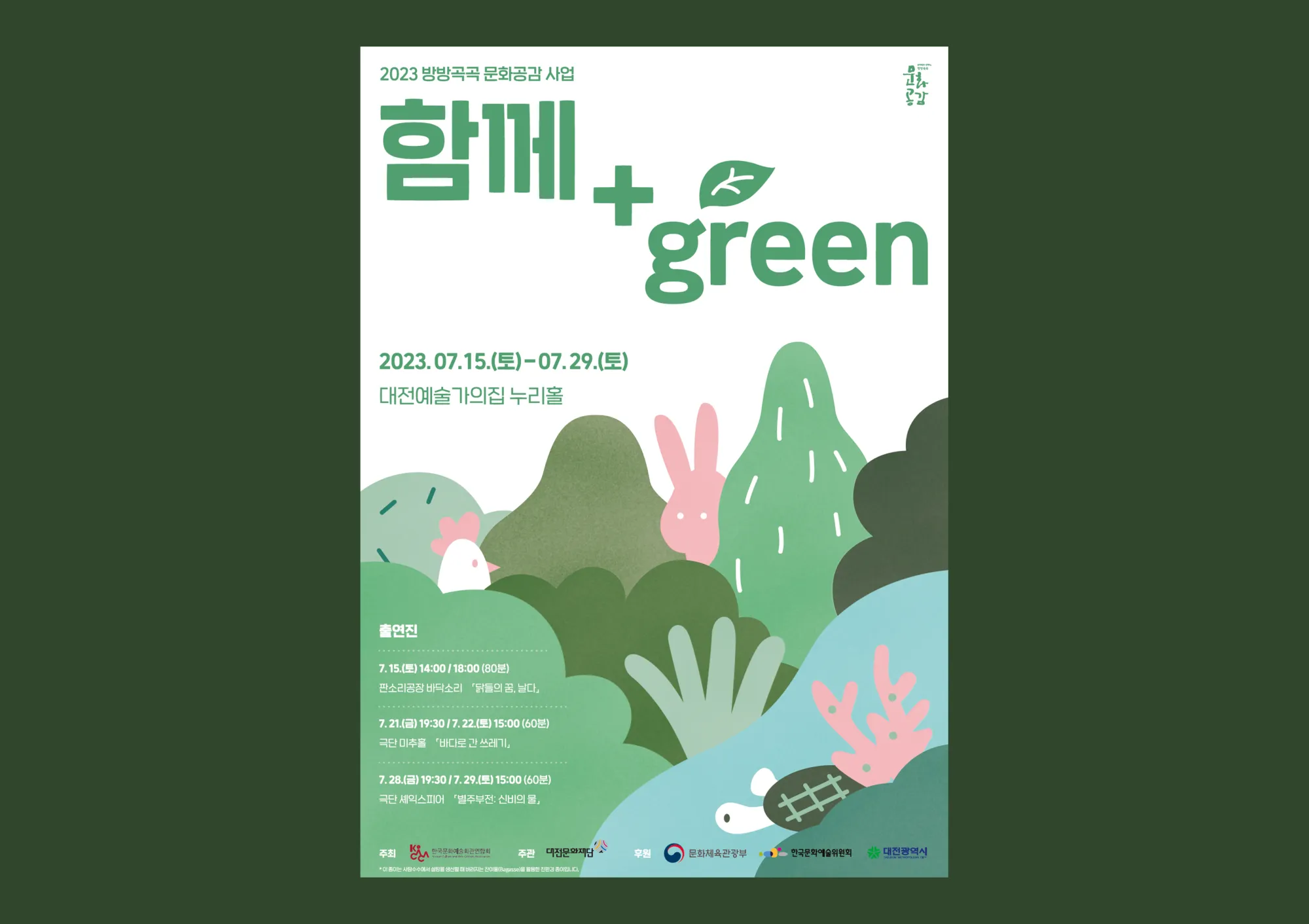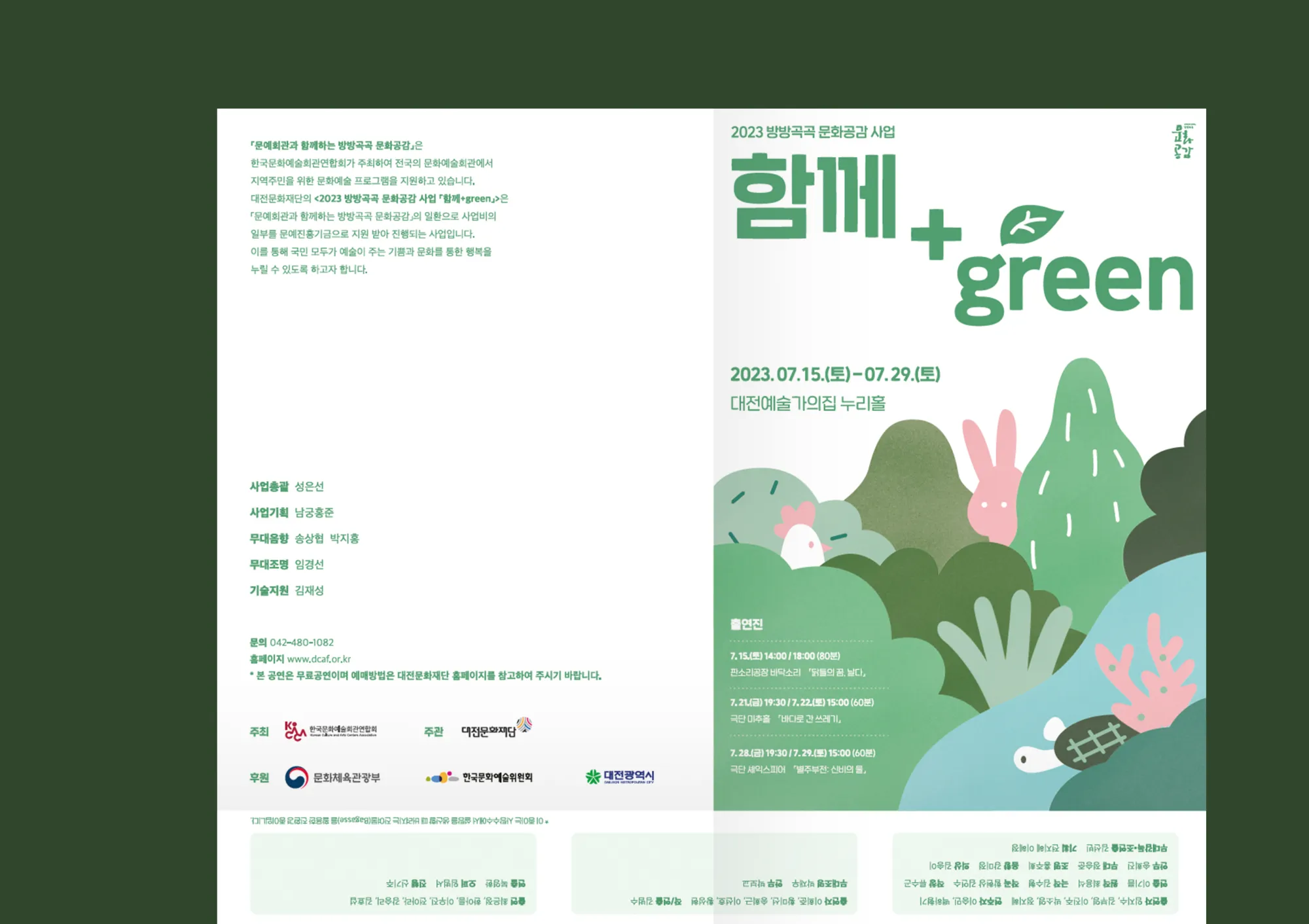 Client : 대전문화재단 한국문화예술회관연합회에서 주최한 2023 방방곡곡 문화공감 사업이며, 대전문화재단에서 주관한 환경 뮤지컬 ‘함께+green’ 입니다. ‘함께+green’은 가족 뮤지컬으로 환경문제를 인지하고, 환경보호를 실천할 수 있도록 환경을 주제로한 공연입니다. 환경을 주제로한 뮤지컬이기때문에 자연을 의미하는 그린계열의 컬러로 그래픽을 디자인하였습니다. 메인 그래픽은 3팀의 공연 내용을 어린이들의 흥미를 끌 수 있도록 동화처럼 표현하였습니다.
