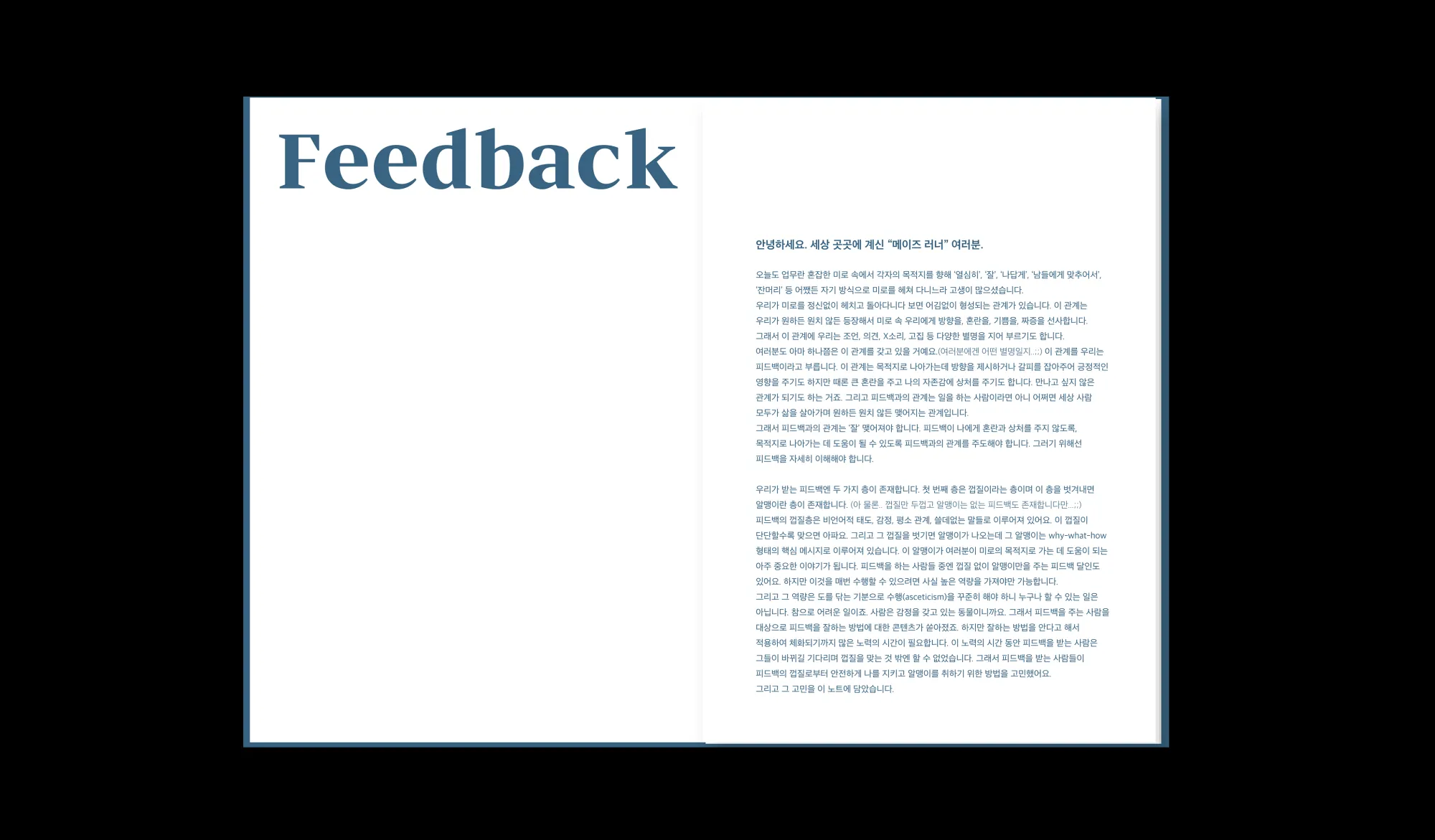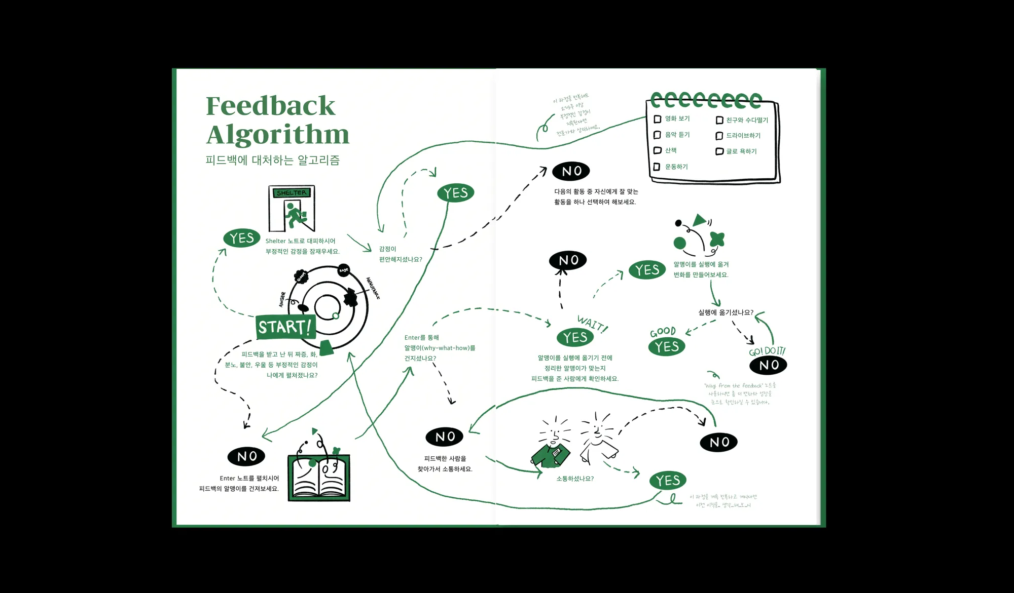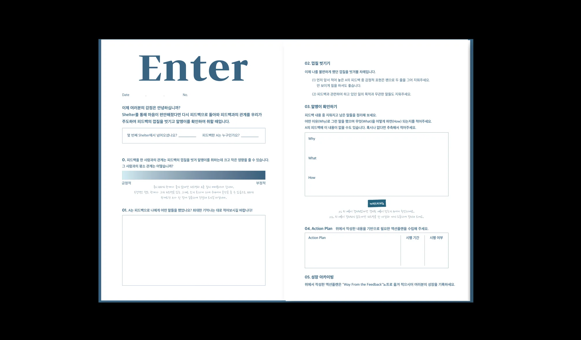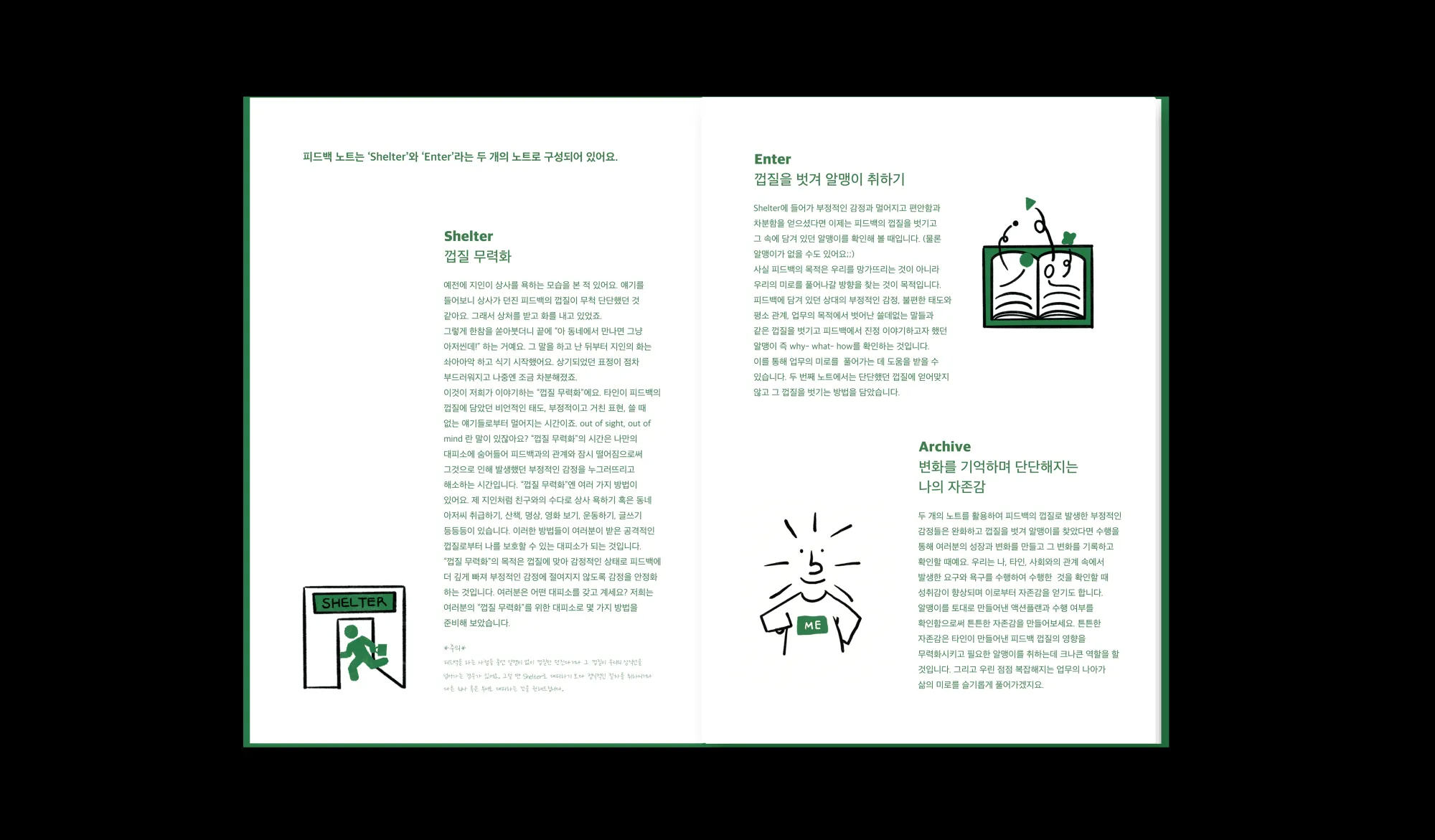 Client : 주식회사 해본사람들 직장생활을 하는 직장인들을 위한 노트입니다. 피드백으로 받은 부정적인 감정을 분리하고 피드백의 포인트를 캐치하여 피드백을 통해 성장할 수 있도록 만들어 줍니다. 피드백노트는 Enter와 Shelter 그리고 부록으로 구성되어있습니다. 데스크 위, 가방 속 어디에서든 가지고 다니고 싶은 기분이 들도록 해외서적 무드의 커버디자인을 했습니다. 노트 속 일러스트는 핸드드로잉으로 제작되어 딱딱하게 느껴질 수 있는 피드백 컨텐츠를 부드럽게 느낄 수 있게 도와줍니다.
