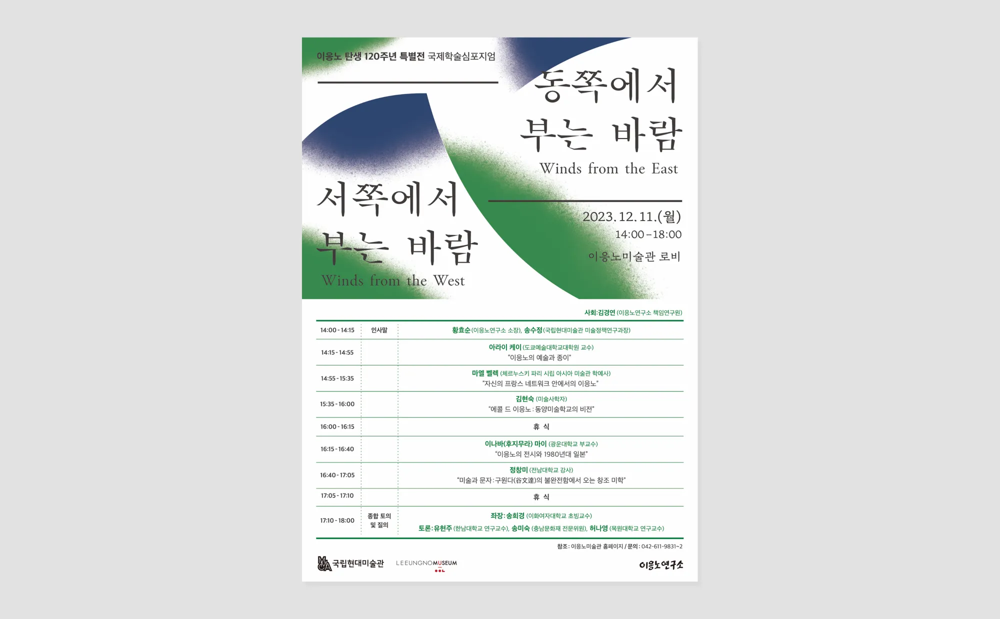 이응노 연구소 이응노 탄생 120주년을 맞아 국립 현대 미술관과 대전 이응노 미술관이 함께 개최한 ‘이응노, 동쪽에서 부는 바람, 서쪽에서 부는 바람’ 전시의 심포지움 포스터입니다. 기존 전시 진행과 함께 진행되지만 전시와는 별개의 행사이기때문에 기존 전시 포스터의 아이덴티티를 해치지 않으면서 새로운 디자인을 해야했습니다. 기존 전시 포스터의 폰트와 컬러를 유지하되, 바람을 표현하는 방식을 다르게하였습니다. 메인 그래픽은 심포지엄이라는 학술적인 컨텐츠를 다루는 행사이기때문에 좀더 간결하고 심플하게 표현하였습니다.