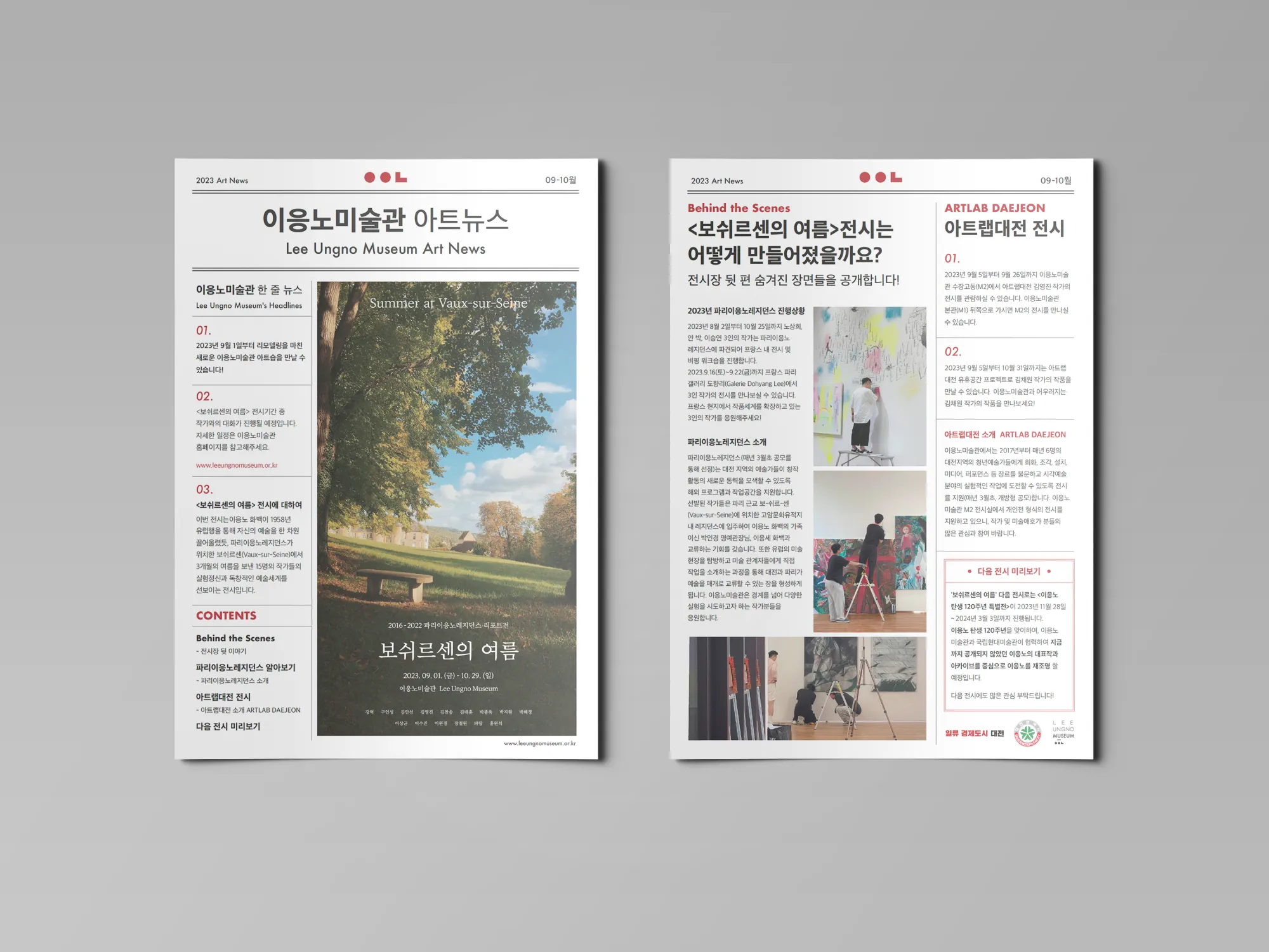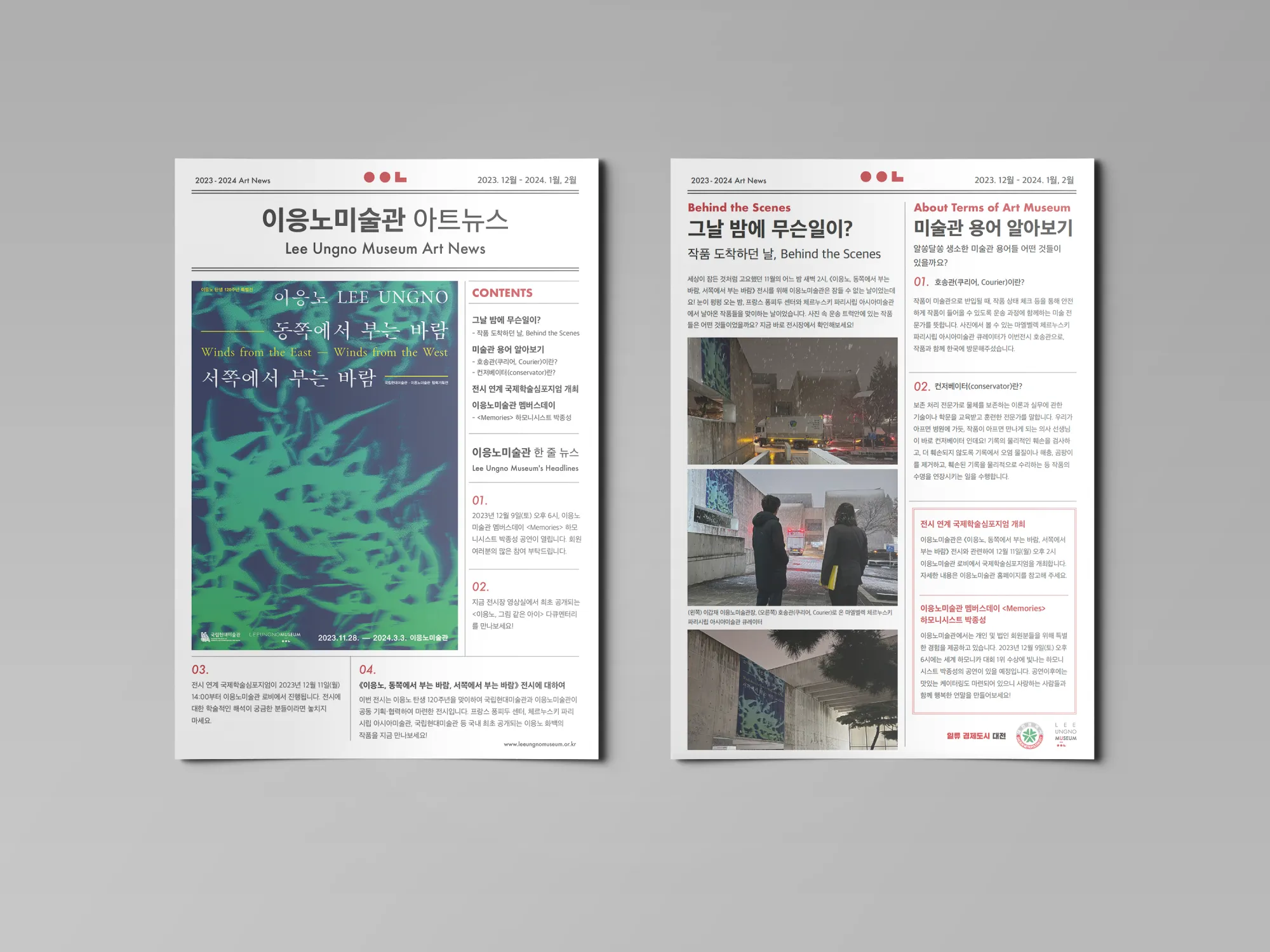 Client : 고암문화예술재단 이응노미술관의 소식 및 진행 중인 전시에 대한 소식과 뒷 이야기를 볼 수 있는 비정기 월간지입니다. 현재 진행 중인 전시의 포스터가 큰 비중을 차지하기때문에 전시의 아이덴티티를 보존하며 정보의 가독성을 높이기 위해 심플한 뉴스페이퍼 형태로 디자인했습니다. 매번 컨텐츠가 달라져도 시리즈 간행물인 것을 표현하기 위해 전체적인 틀을 고정하였습니다.