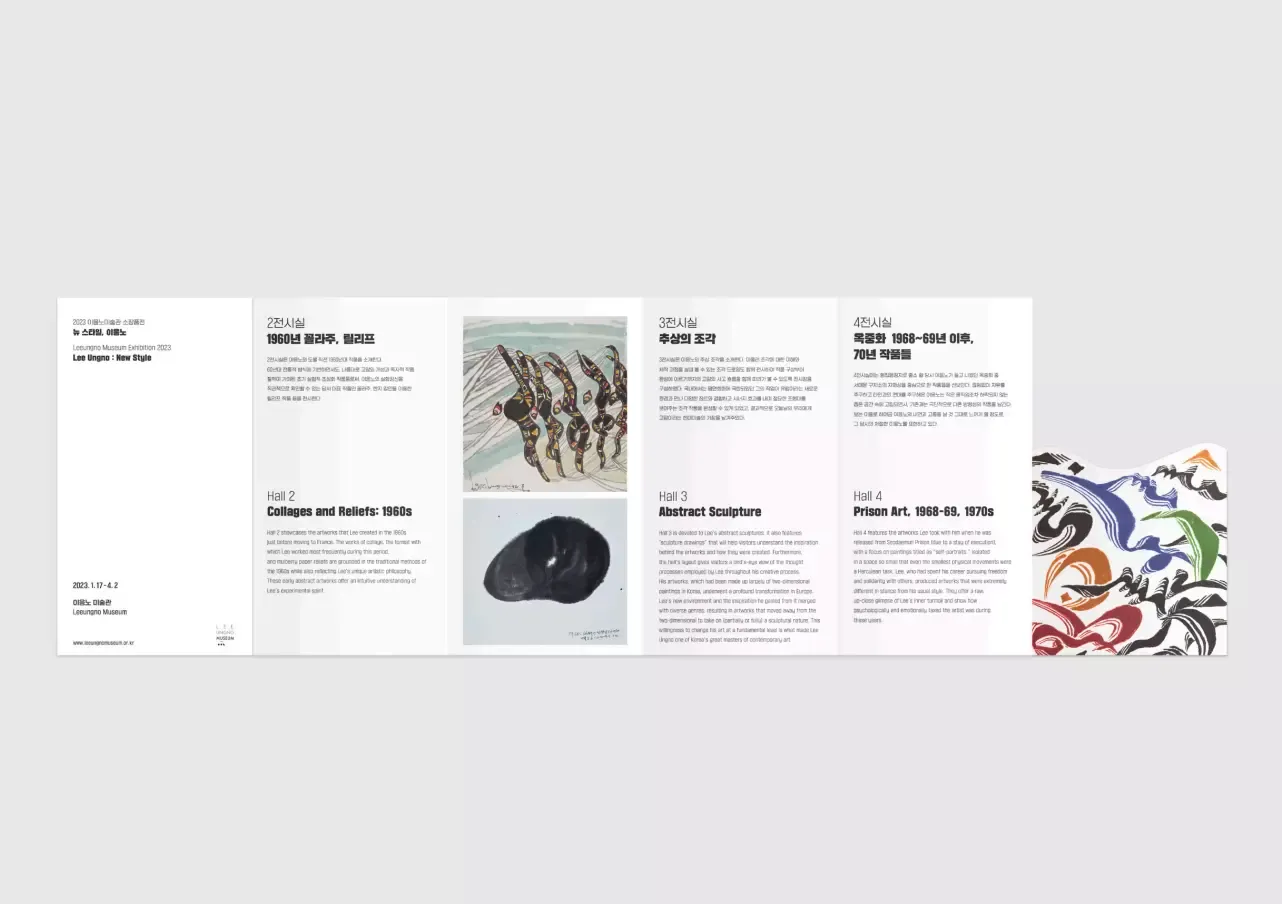 Client : 대전고암미술문화재단 이응노 작가 내면의 작품 철학과 환경의 큰 변화를 겪었던 1960년~70년대의 소장품 기획 전시입니다. 도불과 동시에 서양의 다양한 형태의 추상화와 조형 세계를 확장한 이응노의 별명은 ‘뉴스타일’이었습니다. 작가의 새로운 시도와 실험정신을 시기별로 나눠 전시되었습니다. 고암의 작품 중 아라비안 글씨로 새로운 시도로 한 작품 ‘ ‘ 을 새롭게 표현하여 메인 그래픽을 표현하였습니다. 먹으로 표현된 작품에 컬러를 더해 새로운 작품으로 구성하였습니다. 전시에 필요한 공간 구조물을 구성하였는데, 4전시실의 중앙벽은 감옥에서 수감생활을 하며 그렸던 자화상을 마치 감옥에 갇힌 고암을 훔쳐보는 듯한 느낌을 살려 오픈되어있지만 오픈되지 않은 느낌을 내는 벽을 디자인 했습니다.