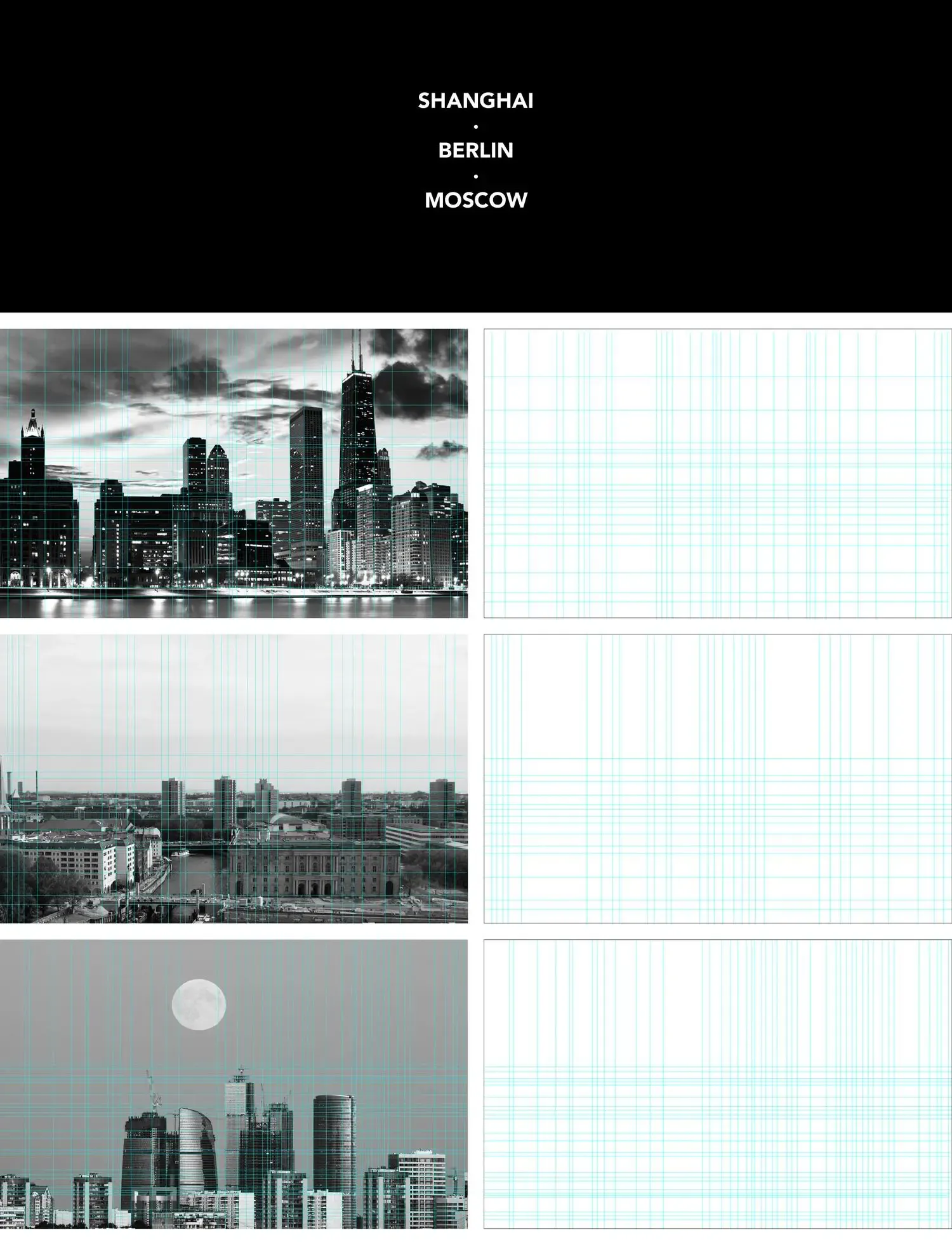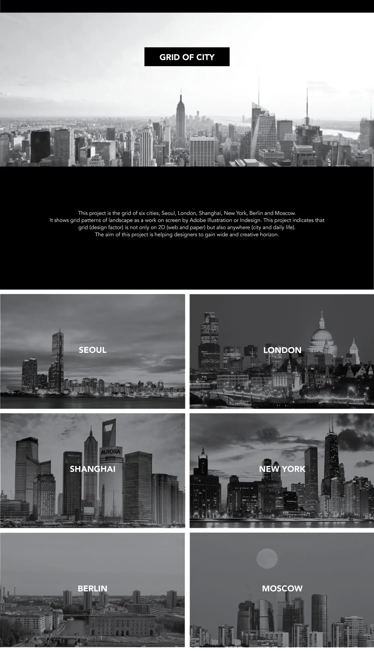 Personal Project 이 프로젝트는 서울, 런던, 상하이, 뉴욕, 베를린 그리고 모스코바, 6개 도시의 그리드를 연구한 프로제트입니다. 도시의 그리드 패턴들은 그리드(디자인 요소)가 오직 화면 속 2D에만 존재하는 것이 아니라는 것을 나타냅니다. 도시와 일상, 우리 생활 어디든 그리드가 존재한다는 것을 알 수 있습니다. 이 프로젝트는 디자이너가 더 넓고 창의적인 디자인적 시야를 가질 수 있도록 도와주는 연구입니다.